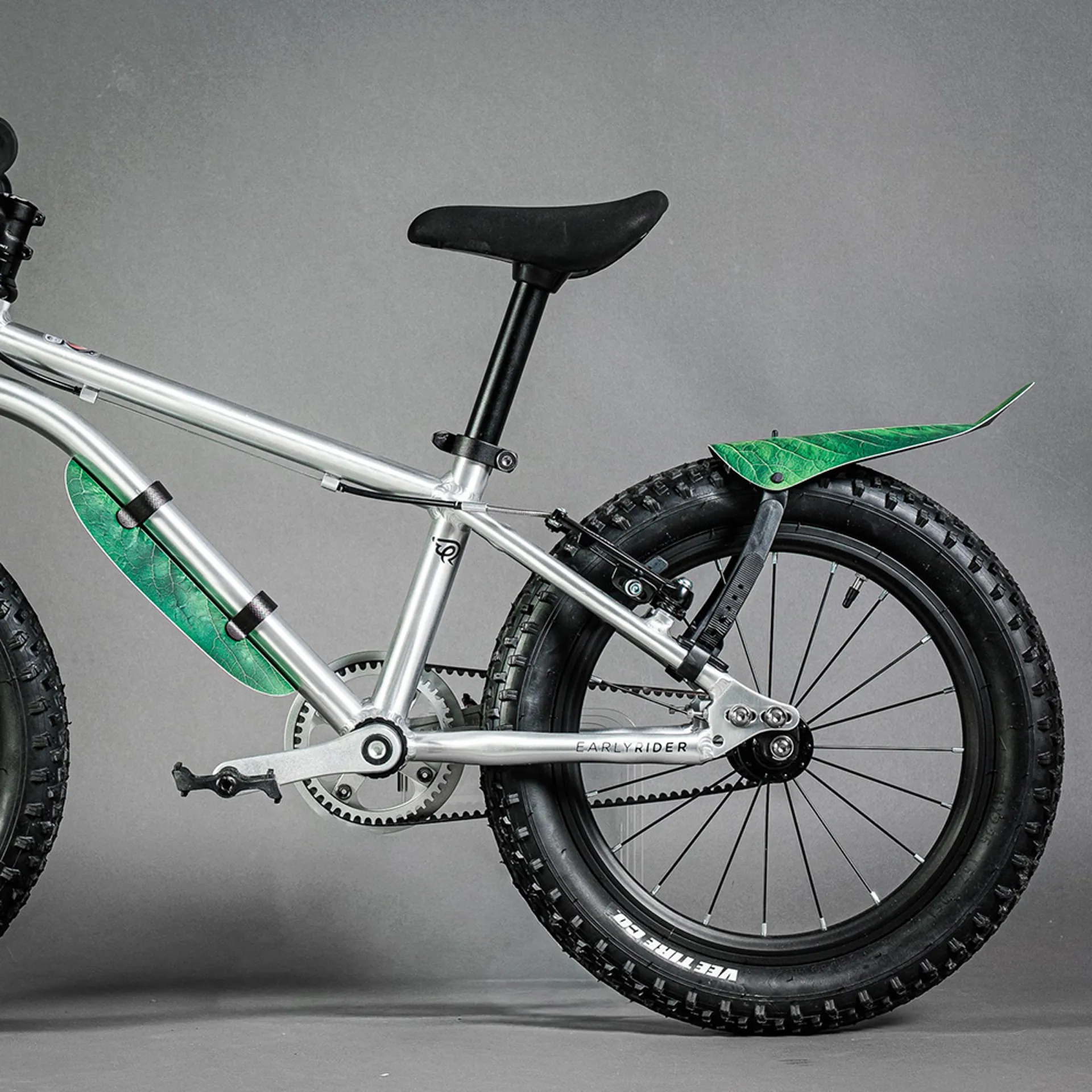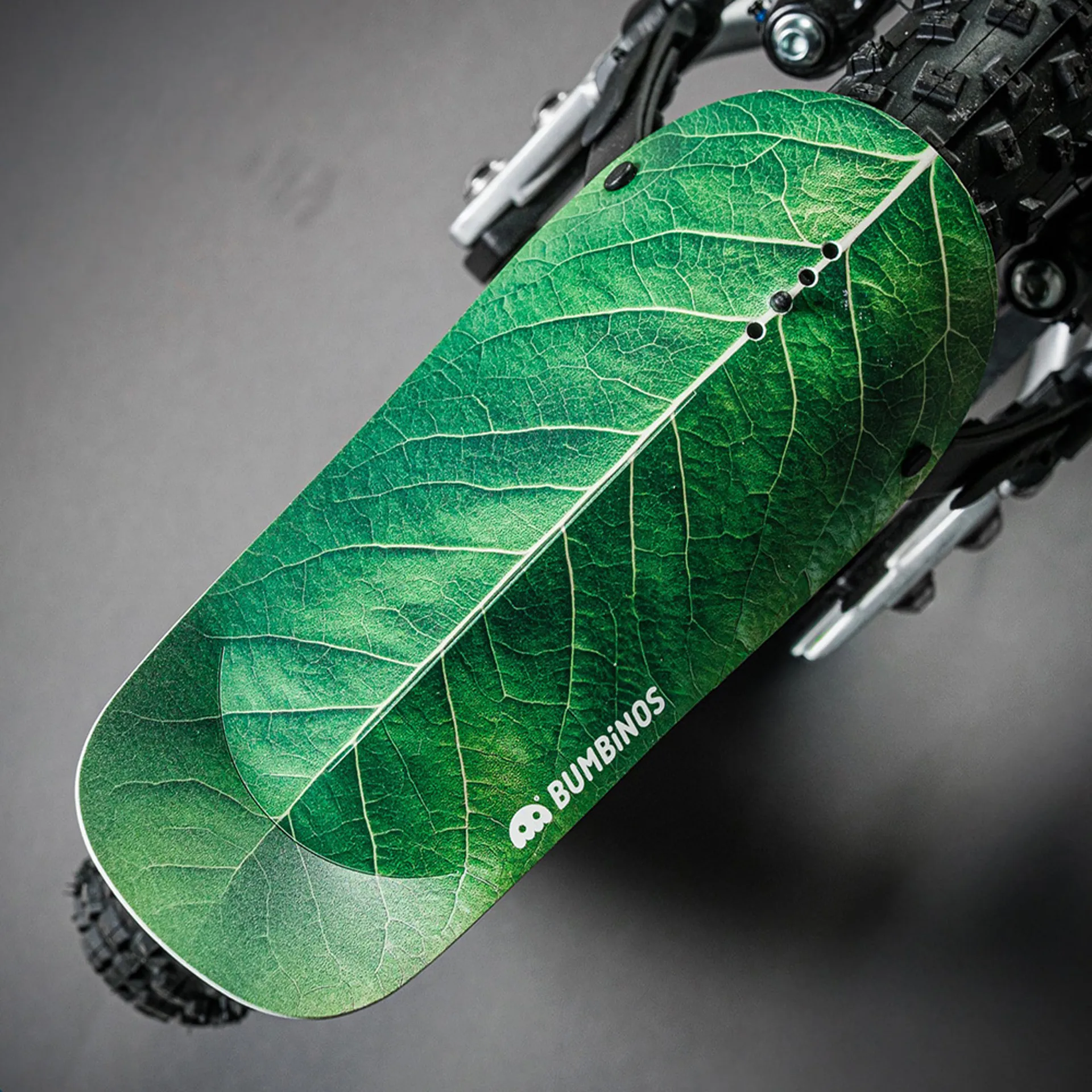 Deep green, leaf veins, camouflage for bikes. Ride through the undergrowth and vanish. Mudguards front and rear, frogs and insects included.