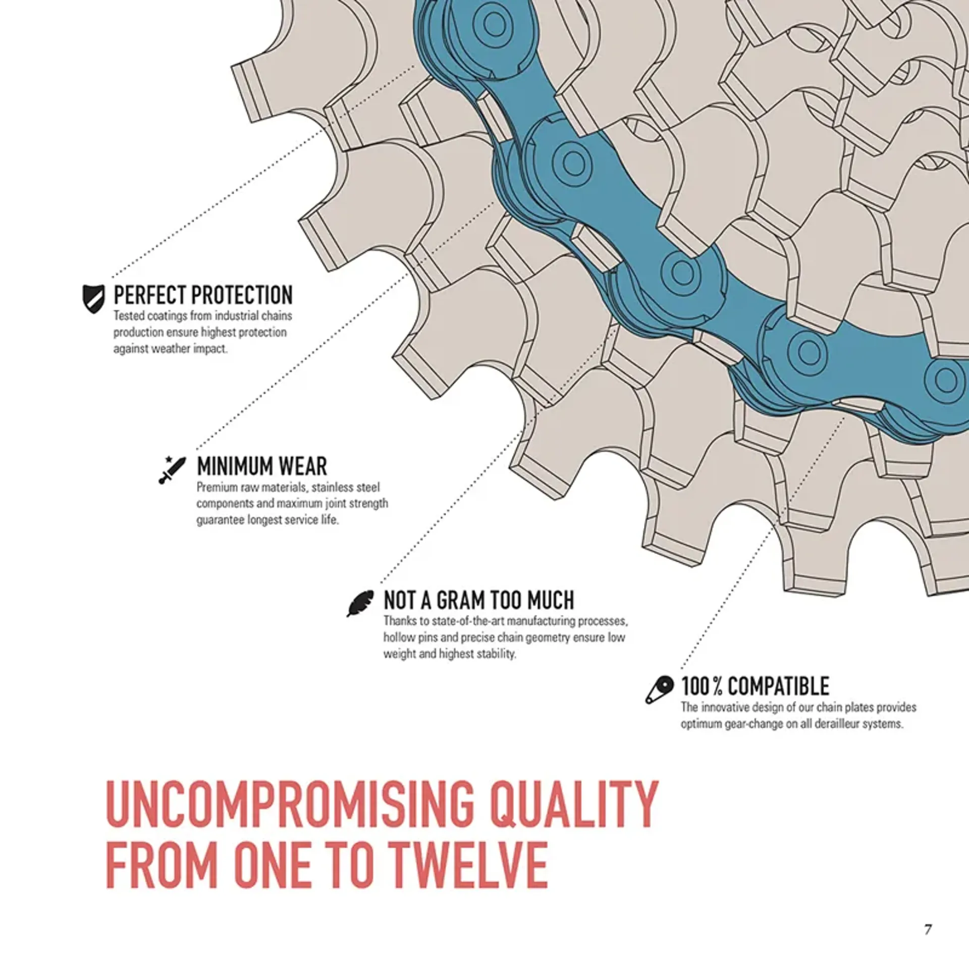 Highly developed Peripheral chamfering of the outer plate ensures optimum gear-changing performance. Innovative radial riveting of the pins, combined with a special pin coating, guarantees top performance and long wear, even under the high forces of cross gearing.